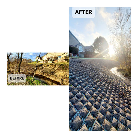 This concrete mat embedded in geogrid is a superior product than traditional "rip rap". Through the use of vegetation this installation is anchor by the grass roots. Making for a permanent erosion solution.